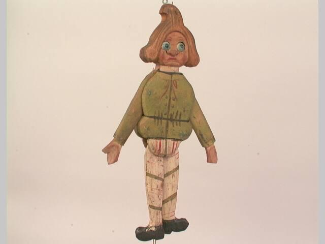 DescriptionWooden jumping jack with segments carved in relief; figure has green jacket with gold buttons and black trim; white trousers with gold bands and black shoes; limbs move and eyes roll when string between legs is pulled.Object NameJumping jack