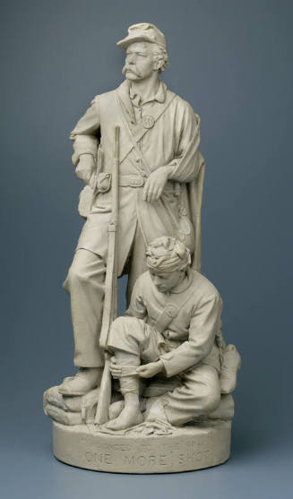 Rogers began work on this sculpture in September 1864, when war-weary Northerners were heartened by General William T. Sherman's capture of Atlanta. By the time Rogers released the group in November, Abraham Lincoln had been reelected by a wide margin, and Sherman's March to the Sea had devastated the South. Rogers' timing was excellent, and his choice of subject, the courage and tenacity of the Union soldier, proved very popular. His sales catalogue described how two wounded Union soldiers had been ordered to the rear during a battle, but one stopped to take one last shot at the enemy before leaving. The standing soldier's left arm is in a sling, and with his good arm he draws a cartridge from his pouch as he casts a flinty stare at the enemy. His comrade sits below, carefully binding up his injured leg.