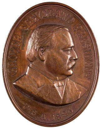 DescriptionOval bronze struck medal with obverse showing clothed bust of Grover Cleveland facing right with legend: "GROVER CLEVELAND PRESIDENT / U.S.A. 1885." Reverse depicts settler and Native American in front of log cabin and farm scene; wreath encircling crossed peace pipe and tomahawk below exergual line; inscription: "PEACE" above scene.