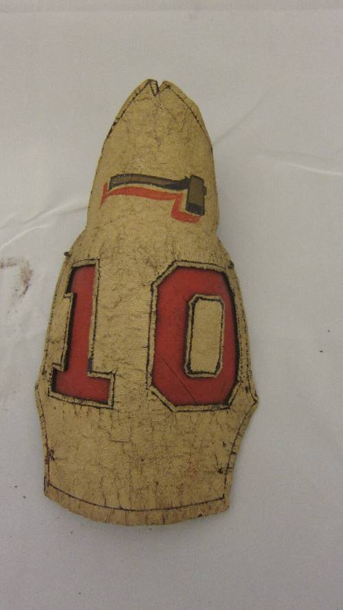 DescriptionYellow (originally white?) painted leather frontpiece from a fire helmet; "10" cut out at center and backed with red painted leather, with hatchet painted in gold and red above.Object NameFire helmet frontpiece: 10