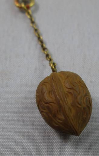 DescriptionCarved wooden walnut charm suspended from gold chain with link at the end for bail.Object NameCharm