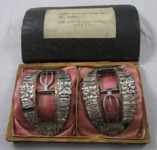 According to a tag affixed to the top of the case, these shoe buckles were worn by Dr. Marx. A letter book dated 1886 is referenced to page 115.