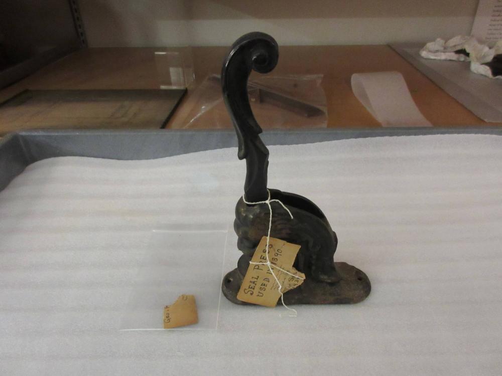 DescriptionCast iron press in shape of lion's head with erect scrolling lever and circular seal; rectangular with d-ends shaped base.Object NameSeal press