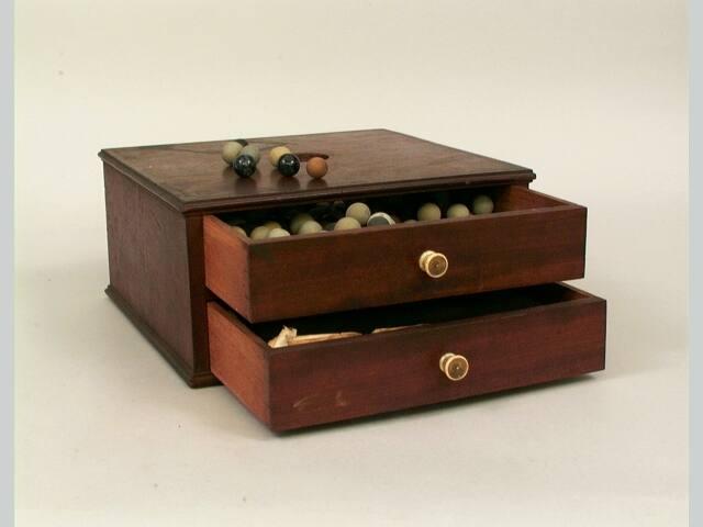 DescriptionWood box with two drawers, round hole cut in center of top, ivory knobs, and carved wood handle; top drawer with collection of 223 clay marbles (163 natural, 43 unglazed black, 17 glazed black); bottom drawer lined with newspaper.Object NameMarble game (223)