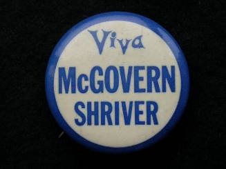 DescriptionCircular pin-back button. White with blue text and border. Text reads: "Viva / McGOVERN / SHRIVER".Object NamePin-back button