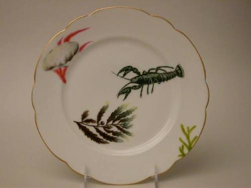 DescriptionOne of a set of twelve porcelain plates from fish set; plates have scalloped gilded edges; center and part of rim hand-painted in polychrome enamels with sea flora and fauna, including fish, seaweed, and shells. Factory mark, decorator's mark, and Latin inscription on underside of plates.Object NamePlate
