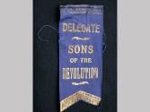DescriptionDark blue silk satin pin-back ribbon with inscription printed in gold: "DELEGATE / SONS / OF THE / REVOLUTION".Object NameRibbon badge
