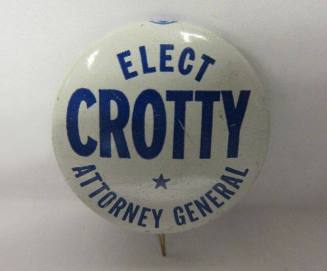 DescriptionPin-back button inscribed "ELECT / CROTTY / ATTORNEY GENERAL" in blue lettering on white background with star below "CROTTY."Object NamePin-back button