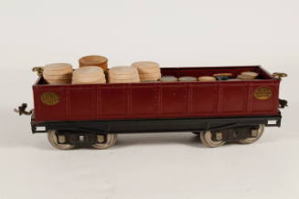 DescriptionGondola. Red and black with gold accents, eight wheels. Filled with wood and plastic barrels. Standard gauge. Plaque on side: "No 212".Object NameRolling stock