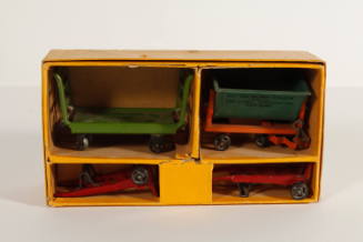 Description163 Freight station set. One 161 Baggage cart (a), green with four black wheels. One 162 Dump car (b), green and orange, four wheels. Two hand trucks (c,d), both red with two black wheels. Yellow cardboard box (e,f).Object NameStation accessory