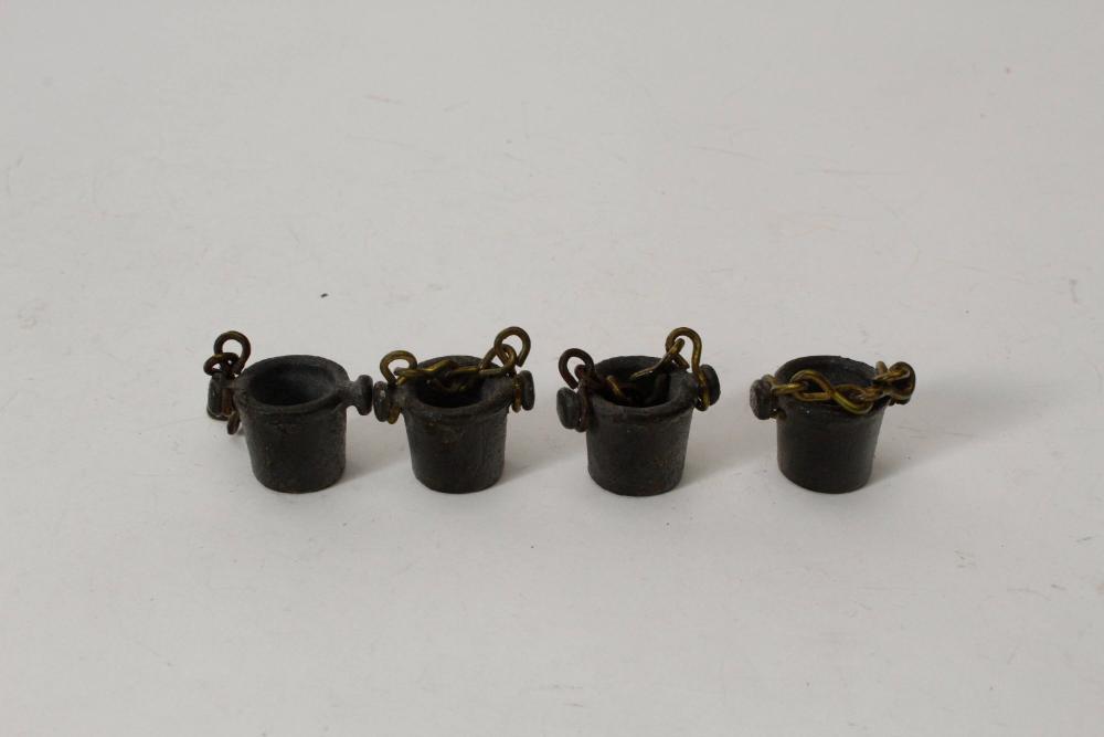 DescriptionStation accessory. Set of four heavy metal pails with gold toned chain attachments for handles (a-d).Object NameFarm figure accessories (set of four)